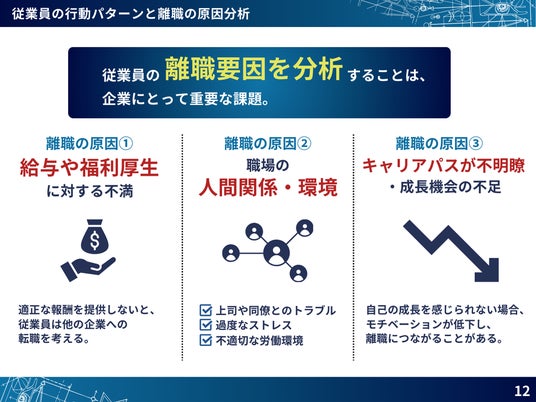 離職について、細分化した原因分析やAI技術の活用事例と共にまとめています。