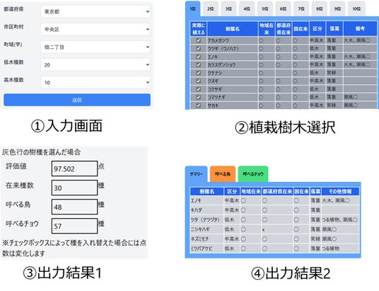 当システムは、野生生物の空間分布や生物種の間の繋がり(食う・食われるの食物網など)の生物多様性可視化データプラットフォームが基盤になっています。宅地や不動産物件など評価したい場所において、鳥と蝶を中心に、在来生物種の生息場所の再生に最大限寄与することができる植栽樹木の組合せを最適化計算し、生物多様性の再生効果を算定できます。これまでこうした緑化事業による植栽の自然再生インパクトは、生物多様性など質的な観点から高解像度で評価することはできませんでしたが、当社が所有する生物多様性ビッグデータと分析ノウハウをアプリケーション化し、自動で、生物多様性再生を最大化する植栽樹種の最適な組み合わせ結果を出力できるようにしました。