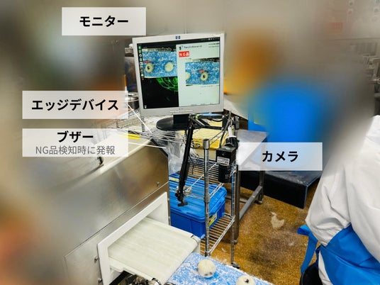 コンベアの上にカメラを設置し、流れてきた黒豆大福が「形状不良」と判断されると、NG品としてブザーが鳴る仕組み