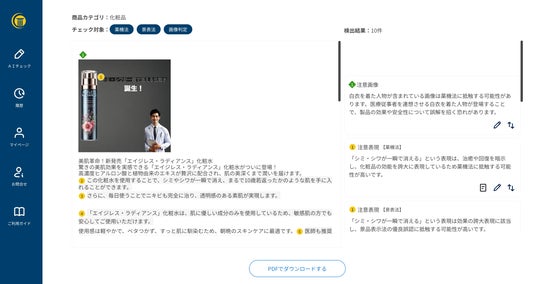 広告チェックAIは、AI技術を駆使して広告内容が法令に準拠しているかどうかを自動でチェックするサービスです。具体的には、薬機法(医薬品医療機器等法)、景表法(景品表示法)、著作権法など、さまざまな法令に対する適合性を確認します。これにより、広告主はコンプライアンスを確保しながら、迅速かつ効率的に広告作成を進めることができます。