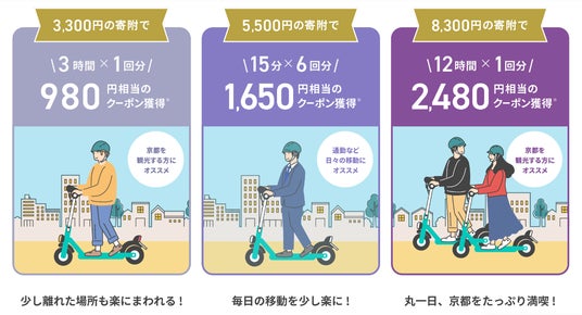 株式会社Luup(本社:東京都千代田区、代表取締役社長兼CEO:岡井大輝、以下「Luup」)は、関西エリアのおでかけ先でふるさと納税を実現する「関西おでかけ納税(R)」の返礼品として京都市が発行するデジタル商品券「京都おでかけ商品券」として、電動キックボードや電動アシスト自転車のシェアリングサービス「LUUP」の乗車クーポンコードを、2024年8月21日(水)より提供開始※予定することをお知らせします。なお、返礼品である「京都おでかけ商品券」は、京都市内の加盟店で1円単位で利用できる金額券とLUUPクーポンコードの2種類ご用意があり、寄附時に選択いただける仕組みになっています。