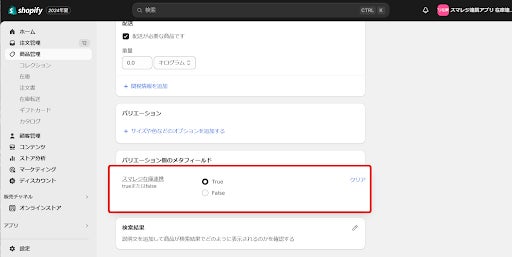 ※shopifyの管理画面在庫連携のON/OFFを切り替える画面