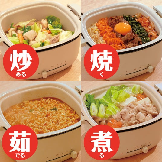 これ1台あれば、卓上で野菜炒めやビビンバ、餃子や鍋、パスタや即席ラーメンまで様々な料理が楽しめます。面倒な調理は、気軽に使えるミニグリル鍋にお任せ!