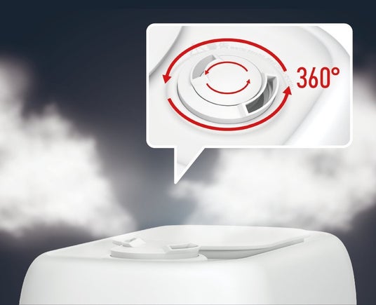 新商品「スチーム アンド ミストL 8L」は、 360°スピード加湿を実現。最大720mL/hのあたたかいスチーム&ミストで、すばやく加湿します。さらに、吹き出し口を360°回転させてスチームの向きを調整できるので、部屋全体を快適に加湿し、置き場所にも困りません。
