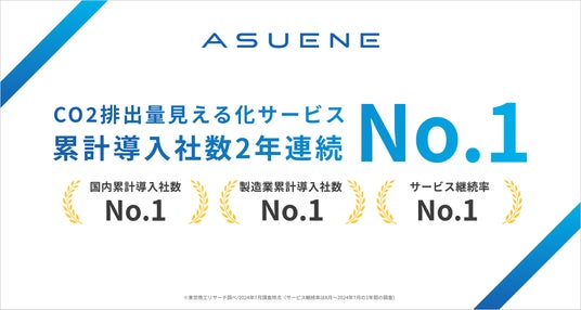 アスエネ株式会社(本社:東京都港区、代表取締役CEO:西和田 浩平、以下「当社」)の運営するCO2排出量見える化・削減・報告・報告クラウドサービス「ASUENE」は、株式会社東京商工リサーチ(本社:東京都千代田区、代表取締役社長:河原 光雄、以下「東京商工リサーチ」)が発行した市場調査レポート「CO2排出量見える化サービス 導入社数調査」において、サービス累計導入社数が9,000社を突破し、国内No.1を獲得しました。また、製造業のみの累計導入社数でも1位を獲得し、 サービス継続率は99%を維持しており、満足度も非常に高い結果となりました。