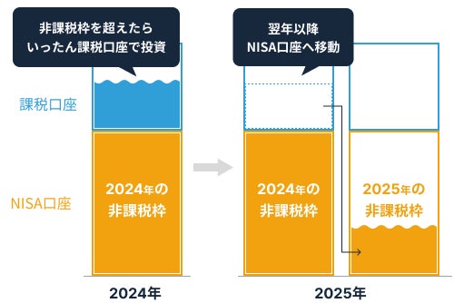 NISAの年間投資枠や非課税保有限度額を超えて入金があった場合、それらの上限額を上回った分は、いったん課税口座で受け入れて投資を実行します。その後、翌年に年間投資枠が利用可能となる、あるいは非課税保有限度額の枠が復活する場合に、NISA口座に自動で資金を移動させることで、投資機会を逃すことなくNISAを最大限利用します。特に退職金や相続など大きなお金を入金した時に有効な機能です。