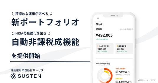 資産運用の自動化サービス『SUSTEN(サステン)』を提供する株式会社sustenキャピタル・マネジメント(サステン・キャピタル・マネジメント、本社:東京都港区、代表取締役: 岡野大・山口雅史)は、2024年8月5日(月)、『SUSTEN』で従来よりも積極的な運用が可能となるポートフォリオの拡充と、NISA口座をできるだけ活用し非課税メリットを得られるよう自動で最適化を図る「自動非課税成機能」の提供を開始しました。