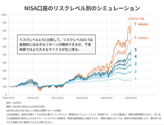 SUSTENの「リスクレベル5」が、世界株式と同等のリスク水準に設定されている中で、よりリターンを追求されたい方のニーズにお応えすべく、リスクレベル6および7を追加し、ポートフォリオを36種類から47種類に拡充しました。この拡充にともない、NISA口座では新たなファンドをご用意、課税口座では既存ファンドの運用内容を変更しました。
