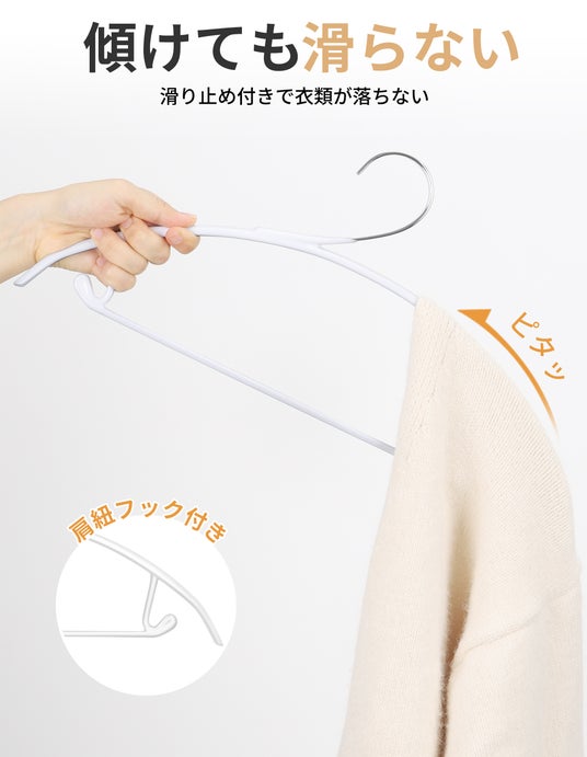 ノンスリップ加工を施しているので、ハンガーが傾いてもしっかり洋服をキープ。