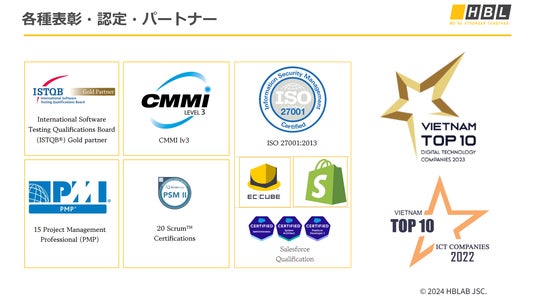 HBLAB Joint Stock Company は、ベトナムIT企業Top10社を受賞して、500名以上オフショア部隊を持つベトナム有力オフショア会社です。ベトナム本社以外に、東京オフィスを構え、2015年の創業以来、日本企業相手に500件以上開発実績を挙げてきました。ニューテック開発に最大の強みを持ち、AI開発のみならず、AR/VR、ブロックチェーン技術の最先端研究も進めています。