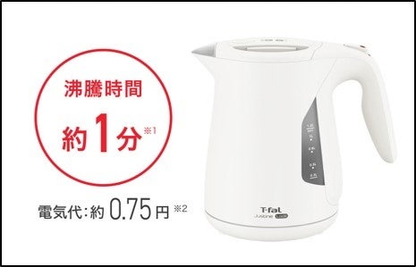 カップ1杯分(140mL)なら約1分(※1)で沸騰。忙しい朝や急な来客でも大丈夫。清潔な水を飲みたい分だけすぐに沸かすことができます。電気代はわずか約0.75円(※2)。
