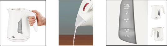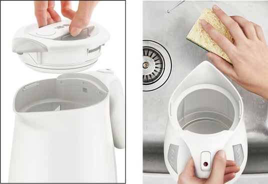 さらに、人間工学に基づいて設計されたハンドルは、手になじんで握りやすく、注ぎやすいのが特長です。注ぎ口は、先端がスリムになって湯量をコントロールしやすくなりました。また、本体の両側にある目盛り付きの窓で、湯量や沸騰状態がひと目で確認できます。さらに、安心機能も充実しています。うっかり倒れてもお湯がこぼれにくい「お湯漏れロック機能」や、やけどのリスクを抑える省スチーム設計のほか、オートオフ機能、空焚き防止機能も付いているので、安心してお使いいただけます。衛生面では、注ぎ口はカバー付きになっているのでほこりが入りにくく、常に清潔に保つことができます。フタは取り外し可能で口が広く、内部に手やスポンジを入れて簡単にお手入れできます。