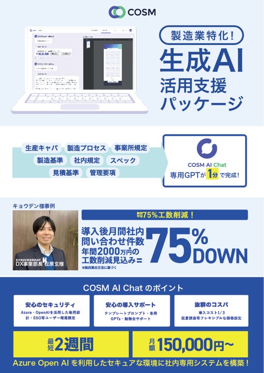 株式会社コズムは、「日本を代表する企業になる」というビジョンを掲げ、製造業をはじめとする様々な業界にDX製品・ソリューションを提供し、お客様の課題解決を推進しています。