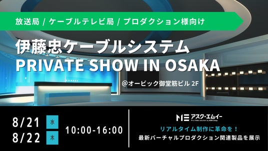 株式会社アスク (本社 : 東京都千代田区) は、2024 年 8 月 21 日 (水) ~ 22日 (木) に開催される【 伊藤忠ケーブルシステム Private Show in Osaka 2024 】に出展いたします。アスクの展示コーナーでは、グリーンバックを備えた簡易スタジオを設け、“リアルタイムプロダクション” 向けの製品群を実際に体験していただけるデモコーナーをご用意いたします。