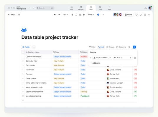 - Zoom Docs の AI ファーストでカスタマイズ可能なデザインは、ドキュメント、Wiki 、テーブルなど、チームやプロジェクトのニーズに簡単に適応し、仕事を一元管理できる場所を提供します。
