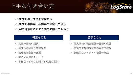 また、我々がビジネスにおいて生成AIと上手く付き合っていくには、生成AIの得手・不得手を人間が理解した上で共に仕事を進めること。つまり生成AIが不得手とする個人情報や機密情報の取り扱いは避け、一方で生成AIの得意な要約や比較を任せると大いに力を発揮するとのことでした。