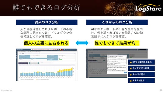 LogStareはこの社会課題への解決策として、親会社セキュアヴェイルが20年以上提供し続けているSOC(Security Operation Center)サービスの知見やノウハウをテンプレート化しソフトウェアに実装すること、そのテンプレートを用いて作成したログレポートを生成AIにセキュリティエンジニアの目線で分析させることで、専門知識を必要としない「誰でもできるセキュリティログ分析」を提供することに成功しました。