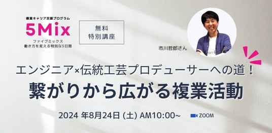 5Mixは、副業や複数の仕事に挑戦したい方々を全力でサポートする複業キャリアに特化したプログラムです。今回の特別講座では、講師に大手電機メーカーのエンジニアとして働きながら、伝統工芸の魅力を広める活動もされている市川哲郎さんをお招きします。市川さんご自身の経験を通じて、人とのつながりがどのように複業の可能性を広げるかについて、お話しいただきます。
