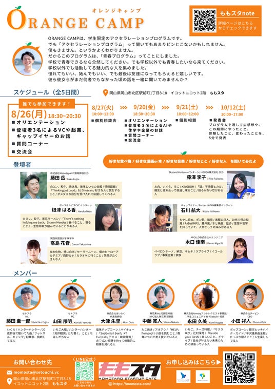 ORANGE CAMPは、学生限定のアクセラレーションプログラムです。でも「アクセラレーションプログラム」って聞いてもあまりピンとこないかもしれません。僕もきません。というかよくわかりません。だからこのプログラムは、「青春プログラム」ってことにしました。学校で青春できるなら全然してください。でも学校以外でも青春したいなら来てください。学校以外でも活動してる魅力的な人を集めました。憧れてもいい、妬んでもいい、でも最後は友達になってもらえると嬉しいです。彼ら彼女らがまだ何者でもなかった頃の話を一緒に聞いてみませんか?