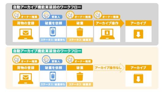 今回リリースした自動アーカイブ機能を設定し、利用することで、荷物のワークフローが最終ステータスに到達した時点で自動的にアーカイブされるため、管理者による手動処理が不要になります。