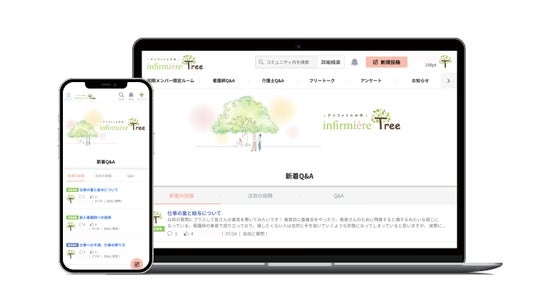 「infirmiere Tree」は、看護師が日頃業務で感じている不安や不満、悩みを共有しあい、相談しあうことができるコミュニティサイトです。自身の職場に限らず、看護師という仕事に関わる全ての人がつながり、交流・相談を行えるような場所になっています。