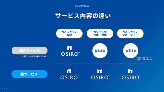 コミュニティ専用オウンドプラットフォーム「OSIRO」を提供するオシロ株式会社(本社:東京都渋谷区、代表取締役社長:杉山 博一、以下 オシロ)は、従来の「OSIRO」のサービスであるコミュニティ設計・システム提供にとどまらず、コミュニティの運営までを含めた、コミュニティに必要な全ての業務を担う新サービスの提供を2024年7月より新たに開始しました。これにより、オシロはパートナーとして業務提携を締結したクリエイターやブランド・企業に、これまで人材や予算不足でコミュニティ運営にハードルを感じていた課題を解決する手段として、新たなサービスを提供します。