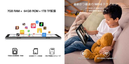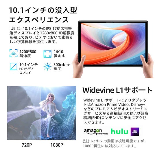 ディスプレイ: 10.1インチHD解像度のIPS(178°超広視野角提供)ディスプレイ。Widevine L1対応で、1080P画質の動画視聴が可能。