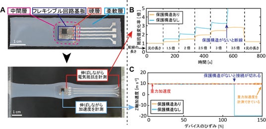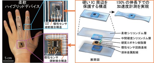 太田准教授らの研究グループは、液体金属を用いた伸びる電気回路と、柔軟性が部位によって異なる基板を用いて、既存の硬質な回路素子を柔軟なデバイスに組み込む技術を開発しました(図1)。この技術により、デバイスを2.5倍の長さまで伸ばした際も硬質な慣性センサICと同等のデータ計測精度・再現性を有するストレッチャブルハイブリッドデバイスを実現しました(図2)。