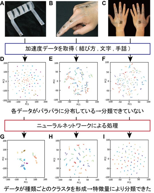 本研究グループは、硬質なICにゴムのような高い柔軟性を有する基板と液体金属配線を組み合わせて、高いデータの再現性を両立できる「ストレッチャブルハイブリッドデバイス」を実現しました。このデバイスから得たデータをAIによって分類することで、10種類の結び目の形状、空中に書いた26種類のアルファベット、65種類の手話の単語をそれぞれ87 %、98 %、96 %の正答率で分類することに成功しました。