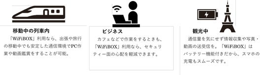 海外旅行に出かける際に借りるイメージが強いWi-Fiレンタルですが、日本国内でもビジネス、観光、Wi-Fi環境の整っていない場所や月末のギガ不足での利用など、ご活用いただけるシーンが多くあります。