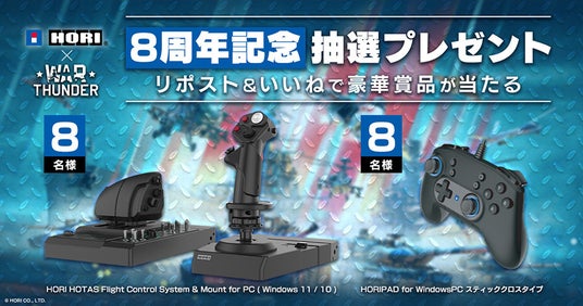 公式Xアカウント(@WarThunderJP)をフォローの上、ハッシュタグ"#WTJP8years"付きの対象ポストをリポスト&いいねすると抽選で8名様へ豪華賞品をプレゼントします。ゲーム周辺機器メーカー株式会社ホリ(https://hori.jp/)様の協力によりDMM GAMESと開発会社Gaijin Entertainmentが連携しながら本気で作り上げた新型フライトスティック「HORI HOTAS Flight Control System & Mount for PC (Windows 11 / 10)」と新発売の汎用型ホリパッド「HORIPAD for WindowsPC スティッククロスタイプ」が当たりますので、ぜひ奮ってご応募ください。