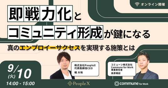 コミュニティサクセスプラットフォーム「Commune(コミューン)」と、カスタマーサクセスマネジメントツール「SuccessHub(サクセスハブ)」を提供するコミューン株式会社は、エンプロイーサクセス事業を推進する株式会社PeopleXと、カスタマーサクセス職のエンプロイーオンボーディングに関する共同研究を実施したことをお知らせいたします。共同研究のアウトプットとしてホワイトペーパーを公開し、9月10日にセミナーも開催します。