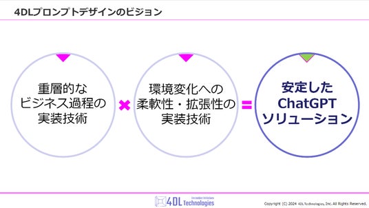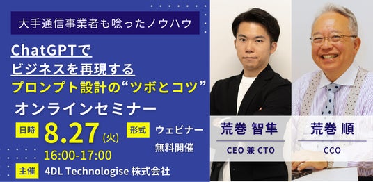 4DL Technologies 株式会社(本社:千葉県千葉市、代表取締役CEO兼CTO:荒巻 智隼、以下「4DL」)は、2024年8月27日16時より《~生成AIで複雑なビジネスを再現するための4DLChatGPTプロンプトデザイン~》(以下 4DLプロンプトデザイン)と題して無料オンラインセミナーを開催します。