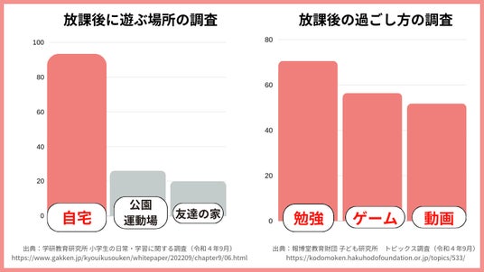 学研教育総合研究所が小学1年生から6年生までの子どもを対象に行った、放課後に遊ぶ場所の調査では、8割が「自宅」と回答しています。
