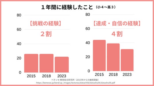 ベネッセ教育研究所が2015年から現在まで継続して行っている調査から、1年間で達成・自信の経験や挑戦の経験をした子どもたちが非常に少ないことが分かります。