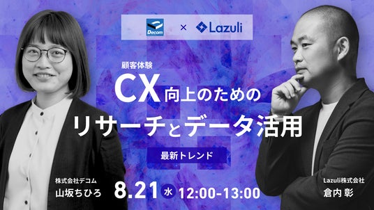 AI技術を活用した、クラウド型商品マスタ「Lazuli PDP」の開発・提供を行うLazuli株式会社(本社:東京都千代田区、代表取締役:萩原 静厳、以下Lazuli)は、インサイトリサーチによるアイデア開発支援を手掛ける株式会社デコム(所在地:東京都千代田区、代表取締役社長:大松孝弘、以下デコム)と共催で、8月21日(水)商品開発やマーケティング等の担当者に向けたオンラインセミナー「CX(顧客体験)向上のためのリサーチとデータ活用 最新トレンド」を実施します。