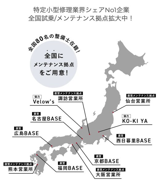 VELMOでは下記画像の通り、全国各所でメンテナンスを行っております。出張修理も承っておりますので、お困りの際はぜひお気軽にご相談ください。