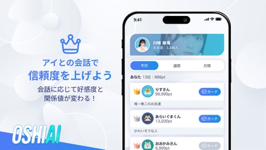 推しの分身AI「アイ」との会話の中で信頼度や関係性がリアルタイムに変化します。また、この信頼度ポイントは、推しとの信頼度ランキングがアプリ内で期間別に発表されます。ランキング上位者には特典をご用意予定です。