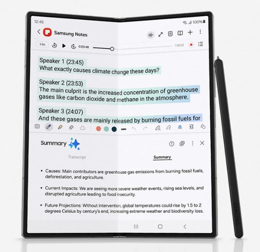 Galaxy Z Fold6 では、折り畳み式画面の特長を活かしてGalaxy AIのパワーを有効に活用するための豊富な機能が盛り込まれています。「ノートアシスト」*1機能では、簡単かつ手短にミーティングメモを作成するために翻訳・要約したり、自動でフォーマットを適用することができます。さらに、Samsung Notes内に文字起こし機能が追加されたことで、録音した音声の文字起こしから翻訳・要約までを完結することもできます。Samsung Notes*2の「PDF翻訳」を使用すれば、PDF内の文章を翻訳することも可能です。また、新たに登場した「 AI スケッチ」*3 機能では、写真やノートのアプリ上に簡単なスケッチを描くと、それをもとにした完成度の高い画像を生成してイメージの候補を出してくれます。 これらの機能の操作は、別売りのSペンを使うと、より精緻に行うことができます。