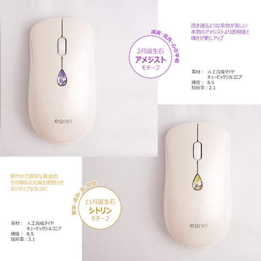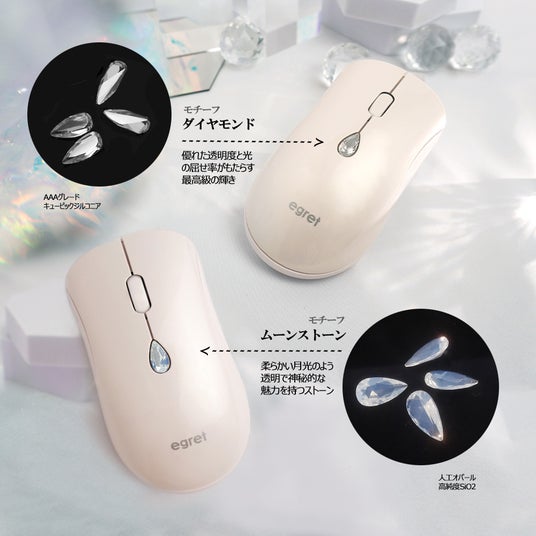 約4カラットを超える大粒のキュービックジルコニアをあしらった、ワイヤレスマウスです。【大粒約4カラット】キュービックジルコニアをあしらった上品で大人かわいいデザイン【すぐに接続・簡単操作】機械が苦手な方でも直感的に操作できる設計【高い機能性】静音ボタン・3段階のDPI調節・長持ちバッテリーで超軽量