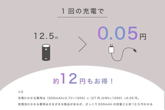 同梱のケーブルをパソコンのUSBポートに挿せば手軽に充電ができるので、乾電池式のように電池の交換は不要。乾電池と比べてかかる費用は、なんと250分の1!(※2)