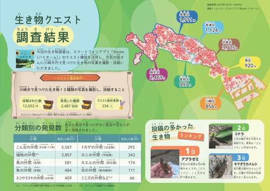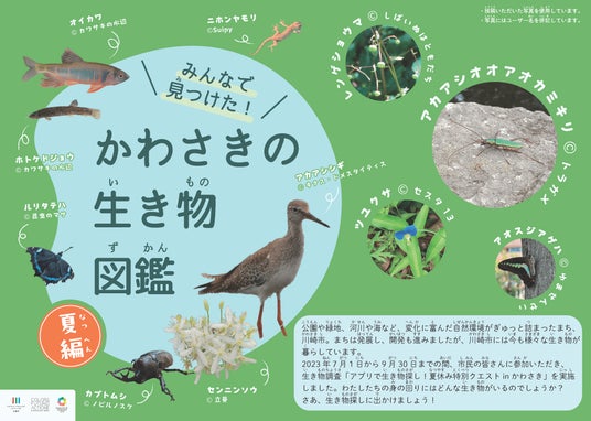 クエスト期間に投稿いただいた生き物の写真は、厳選のうえ川崎市が作成する環境教育・学習用の教材などに使用させていただく予定です。昨年度は同アプリにおいて「夏休み特別クエストin かわさき」を配信し、投稿されたデータをもとに「みんなで見つけた!かわさきの生き物図鑑 夏編」を作成いたしました。