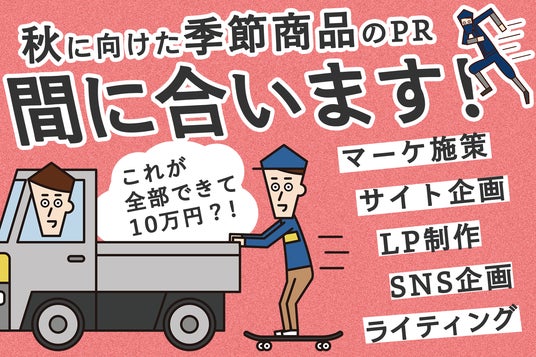 中小企業やスタートアップ企業の秋冬商戦に向け、8月中のお申し込みで、最低10万円、最短1ヶ月でPR施策全体の企画や、ランディングページ(LP)作成、SNS戦略を始めとした、webマーケティングとクリエイティブ支援を網羅するサポートをお試しいただけるキャンペーンを実施しています。