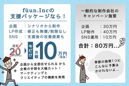 株式会社fūun(東京・新宿/代表 鷲尾和子、以下「fūun」)は、webマーケティングを始めとした、幅広い角度からの事業推進を必要とする中小企業やスタートアップ企業向けに、低コストで企画から製作までの施策を一気通貫で実現するweb支援パッケージの提供を開始しました。