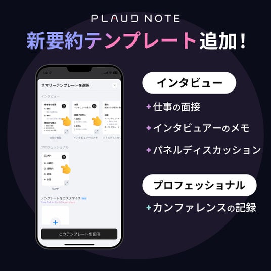さらに、要約テンプレートにも4つの新テーマが登場し、医療現場などプロフェッショナルな現場でPLAUD NOTEがあなたのお仕事を力強くバックアップいたします。