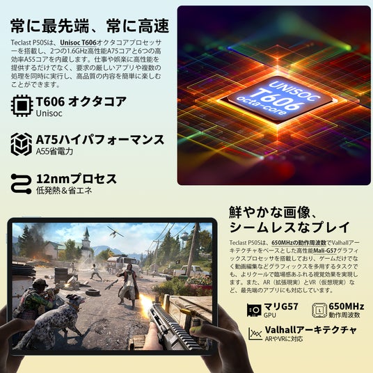 650MHzの動作周波数でValhallアーキテクチャをベースとした高性能Mali-G57グラフィックスプロセッサを搭載しており、ゲームだけでなく動画編集などグラフィックスを多用するタスクでも、よりクールで臨場感あふれる視覚効果を実現します。また、AR(拡張現実)とVR(仮想現実)など、最先端のアプリにも対応しています。