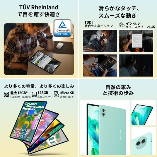△付属品リスト:タブレット本体、Bluetoothキーボード、ワイヤレスマウス、保護ケース、タブレットスタンド、ヘッドフォン、充電器、Type-C充電ケーブル、タッチペン、OTGアダプター、保護フィルム、SDカード取り出しピン、日本語説明書。