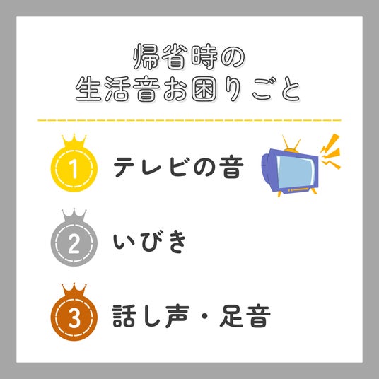 また、帰省時の生活音の悩みについては「テレビの音」に関するものが最多となりました。