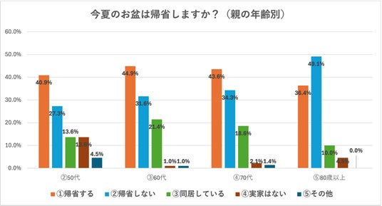 親の年齢別に見てみると、年齢が上がるにつれて「帰省しない」と答える方が増え、80代以上では49.1%が「帰省しない」と回答して「帰省する」を超えました。