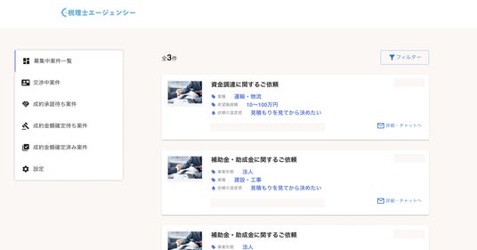 税理士エージェンシーの会員登録が完了すると、管理画面より募集中案件一覧を閲覧できます。
